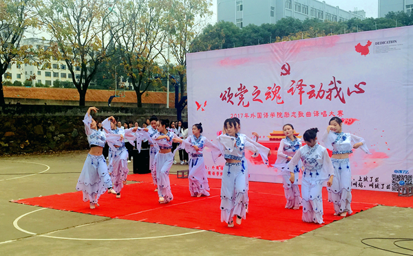 在優美的開場舞后,外語院同學們充滿激情地歌唱祖國,歌頌黨,歌唱愛,歌聲響徹校園。比賽分為譯唱歌曲和自選節目,每班將選定的勵志、紅色歌曲翻譯成英文演唱;自選節目內容多樣,包含舞蹈、情景劇、朗誦、樂器演奏等。最后,商英1701班以優異成績奪冠,其他班級分獲不同獎項。