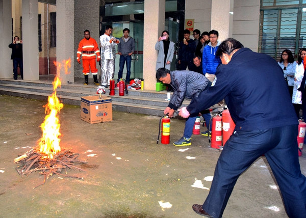 在火場逃生演練活動中,保衛處消防科張紅云、韋瑋、徐杰、熊林雨等先為師生講解滅火器的使用方法、火場逃生自救注意事項和方法、自救器材的使用等基本知識,并現場示范了消防水帶操作。在保衛處專業人員的指導下,師生們體驗了如何正確使用滅火器。火場逃生演練是模擬學生在實驗室上課時突發大火,逃生警報響起,學生迅速做好防煙塵準備,在引導員的指引下,從二樓東、南兩個通道,沿墻壁有序撤離。