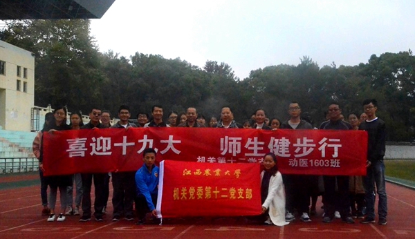 10月15日,為迎接黨的十九大勝利召開,推進機關支部聯系班級工作,機關第十二黨支部黨員與聯系班級動醫1603班同學在學校北區田徑場舉行了“喜迎十九大,師生健步行”主題黨日活動。