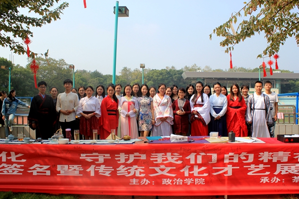 文化興國運興,文化強民族強。10月22日,在黨的十九大勝利召開的喜慶氛圍里,政治學(xué)院以“親近中華優(yōu)秀傳統(tǒng)文化,守護(hù)我們的精神家園”為主題,在校園北區(qū)大學(xué)生活動中心室外舉辦了弘揚優(yōu)秀傳統(tǒng)文化簽名暨傳統(tǒng)文化才藝展示活動。此次活動由政治學(xué)院碩士生導(dǎo)師趙美嵐老師創(chuàng)意策劃,政治學(xué)院全體研究生組織參與,并在江西農(nóng)業(yè)大學(xué)大學(xué)生茶藝社、墨韻書法協(xié)會傾情協(xié)助下順利開展。