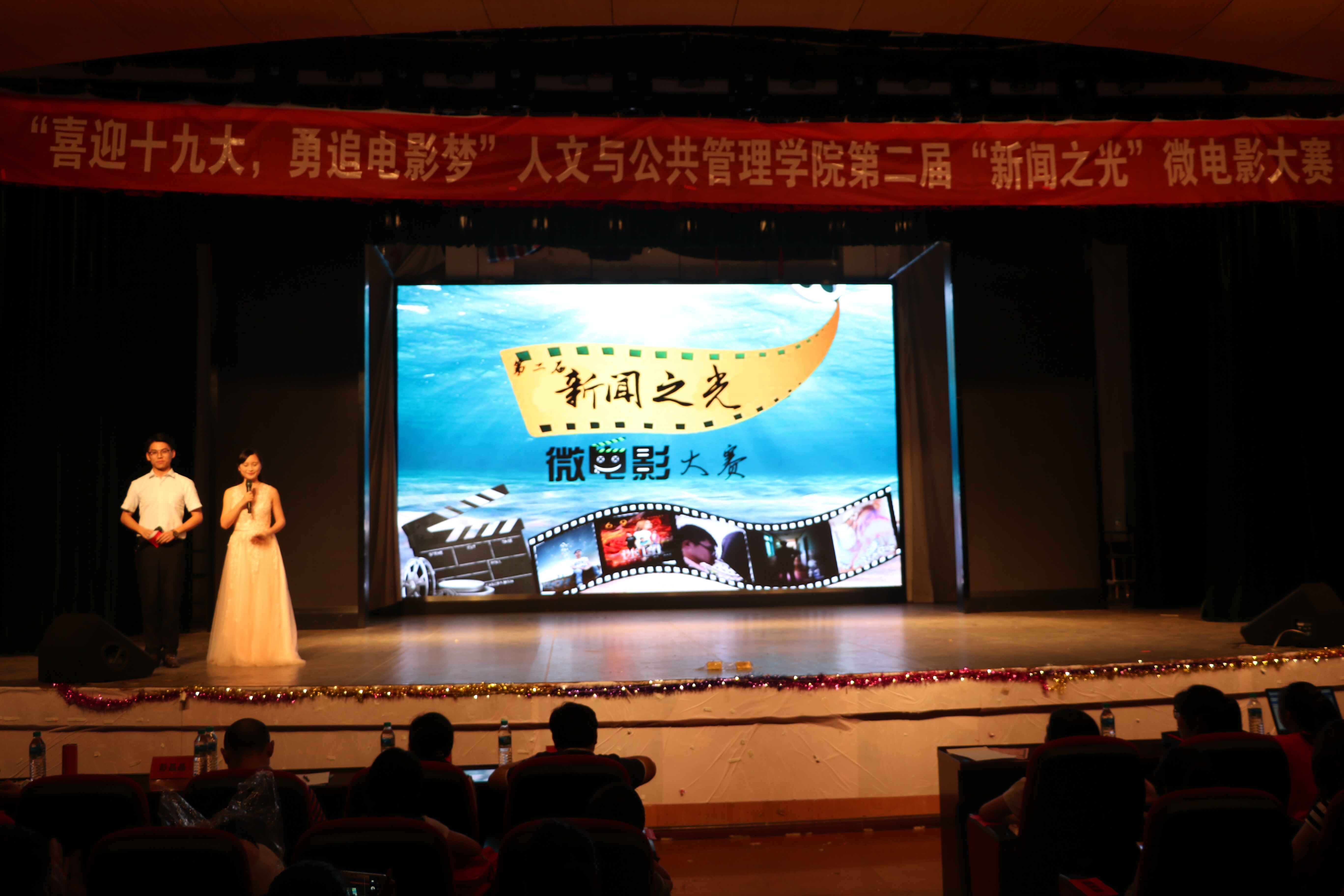 6月9日,人文學院在院音樂廳舉辦“喜迎十九大,勇創電影夢”第二屆新聞之光微電影大賽。院長宋秉斌、中文系主任彭晶晶、院團委書記陳小志等蒞臨現場觀看指導,來自全校的200余名學生共同觀看比賽。