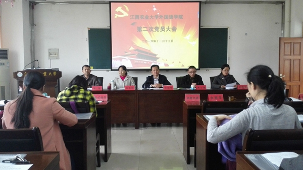 11月15日下午,外國語學院第二次黨員大會召開,校黨委委員、副校長許斌華,校離退休工作處處長、校黨委組織部副部長黃小珊應邀出席指導大會。