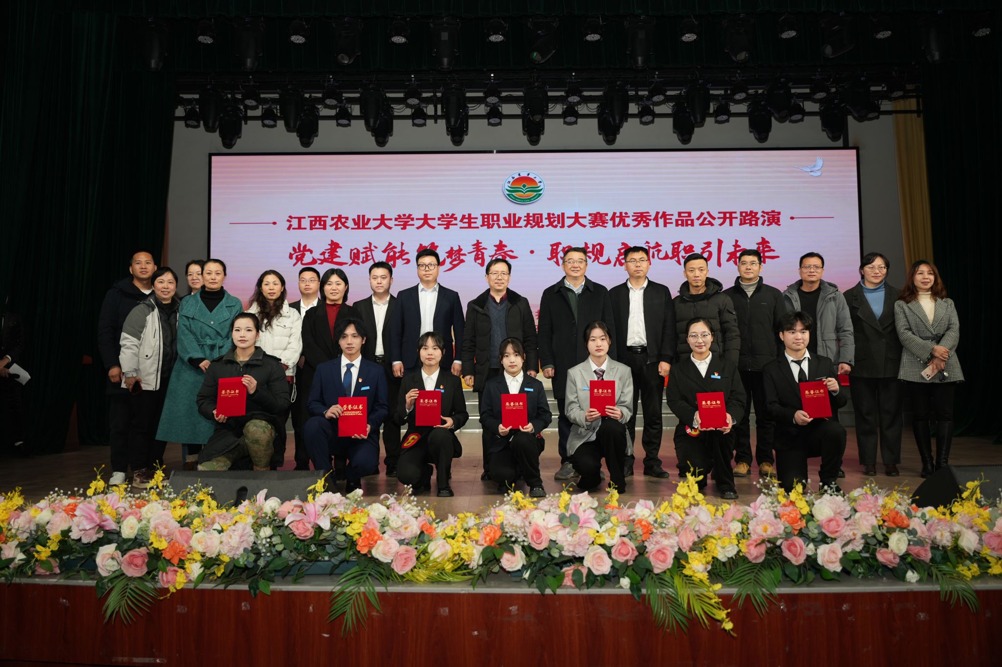 本次路演活動心選團嘉賓由雙胞胎(集團)股份有限公司等7家省內知名企業相關人員擔任,在嘉賓投票環節,園林與藝術學院林學2201班郭子伊同學得票數最多,獲“最佳人氣獎”。活動現場還對我校2024年職業規劃大賽“優秀作品獎”“優秀指導老師獎”“優秀組織獎”進行了頒獎。