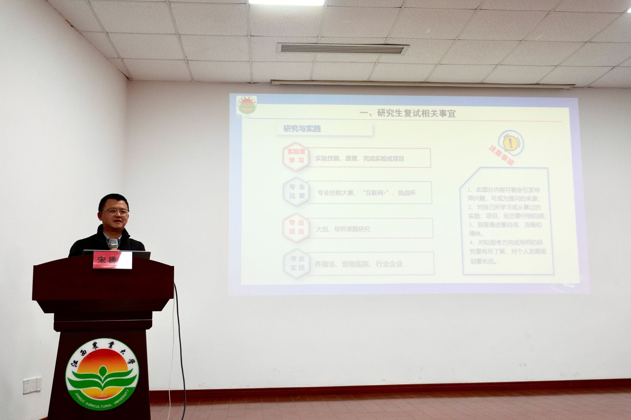 會議伊始,動物醫學教工一支部副書記分別從聯系導師、專業課準備和心態調整等幾個方面進行指導,提醒同學們一是要做好前期準備,熟悉復試流程,準備好相應的證件和資料;二是注意儀容儀表,口齒清晰,塑造良好的第一印象;三是從容應對,保持自信沉穩的心態,展現出自身專業素養和思維能力。