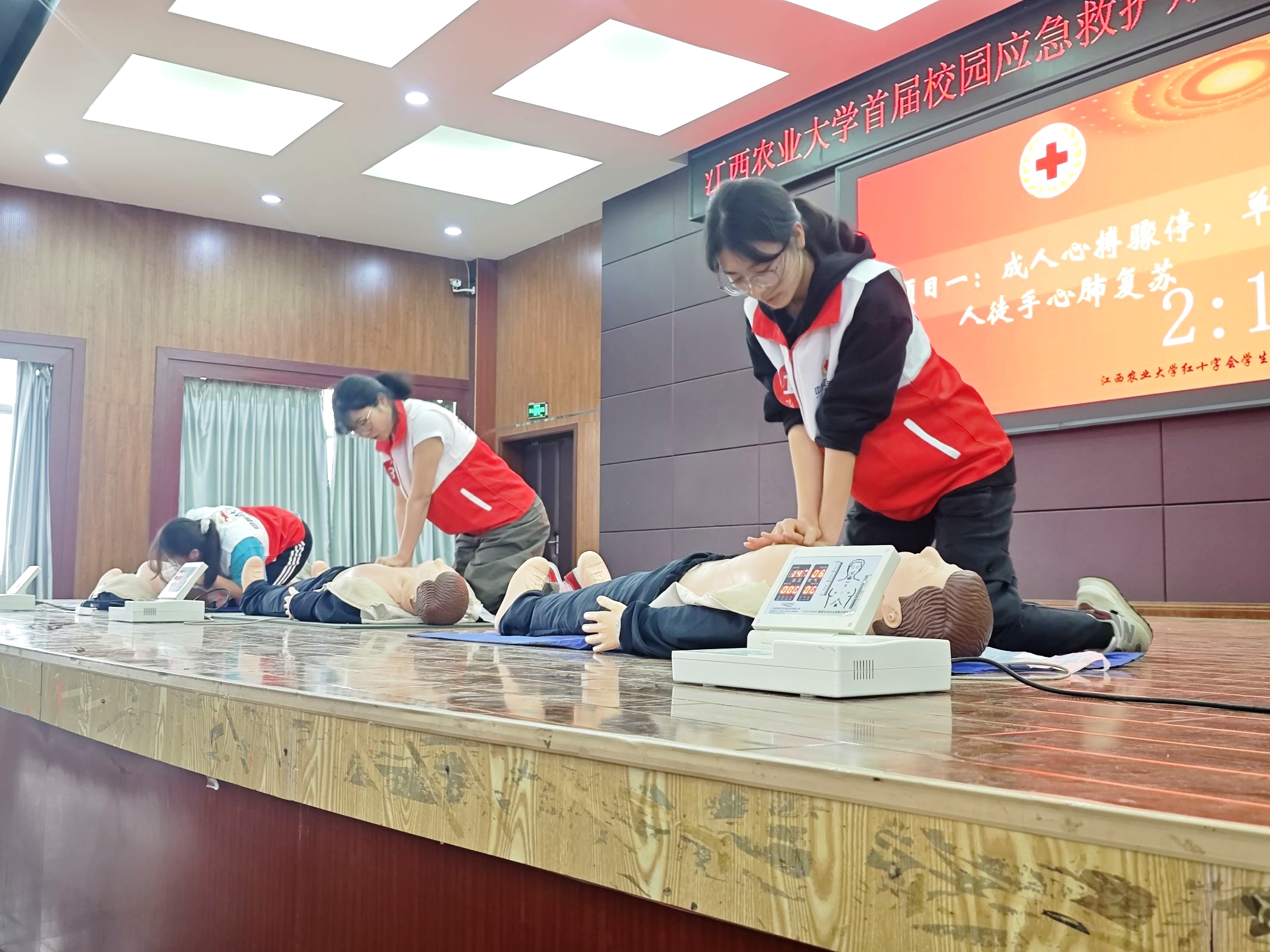 大賽以“實操培訓+理論考核+實操演練”的形式,吸引了全校200余名學生參與。賽前,江西農業大學紅十字會學生分會開展兩輪集中培訓,圍繞心肺復蘇、螺旋反折包扎等急救核心技能進行強化訓練,為比賽筑牢實操基礎。比賽分為理論考核和實操演練兩部分,理論部分采用閉卷答題形式,涵蓋紅十字運動基本知識、救護相關知識、心肺復蘇、創傷救護等內容;實操環節高度還原真實急救場景,模擬成人心肺復蘇、左前臂出血處理以及頭頂帽式包扎等實突發狀況。此外,大賽還設置觀眾互動環節,大屏幕上播放真實現場急救視頻,讓大家直觀感受到急救在關鍵時刻的重要性;應急救護小知識搶答環節,同學們積極舉手,爭相答題,現場氣氛熱烈。