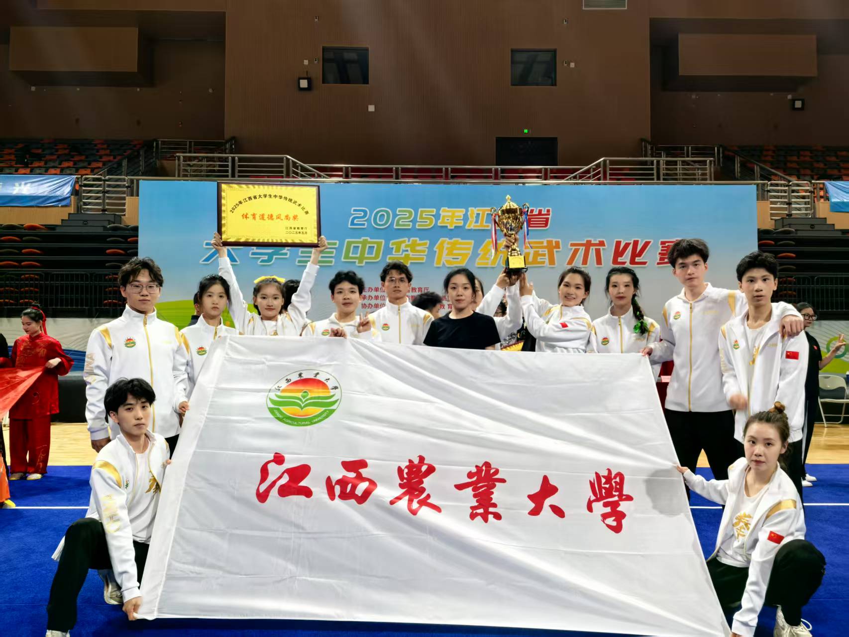 5月8日至11日,由江西省教育廳主辦、江西省學生體育協會承辦的2025年江西省大學生中華傳統武術比賽在贛州舉行。我校武術隊積極進取、團結協作,在團體賽中以233分的總成績榮獲本科甲組比賽團體總分第一名,并斬獲體育道德風尚獎,連續兩年保持團體總分榜首,再次為校贏得榮譽。