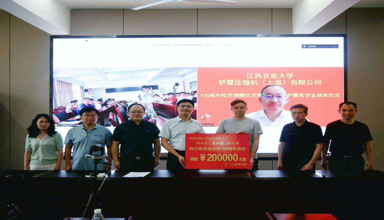 捐贈頒獎儀式線下結(jié)合線上進(jìn)行。據(jù)悉,薩震壓縮機(jī)(上海)有限公司此次向江西農(nóng)業(yè)大學(xué)120周年校慶捐贈人民幣20萬元整。