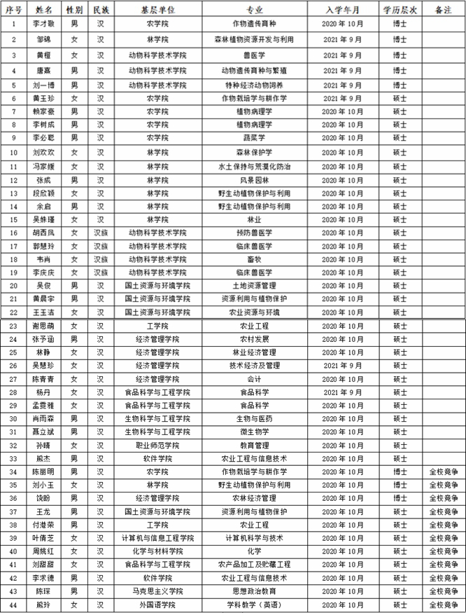 根據教育部、財政部《普通高等學校研究生國家獎學金評審辦法》和江西省財政廳、江西省教育廳《江西省高等學校研究生國家獎學金暫行實施細則》、《江西農業大學研究生獎學金實施辦法》、《關于進一步做好我校研究生獎學金評選工作的補充通知》及《關于預撥2022年普通高校國家資助經費的通知》等相關文件精神,我校近期開展了2022年研究生國家獎學金評選工作,經研究生本人申請,各基層培養單位審核初評,校研究生獎學金評審領導小組評審,現將我校2022年研究生國家獎學金獲得者候選人公示如下: