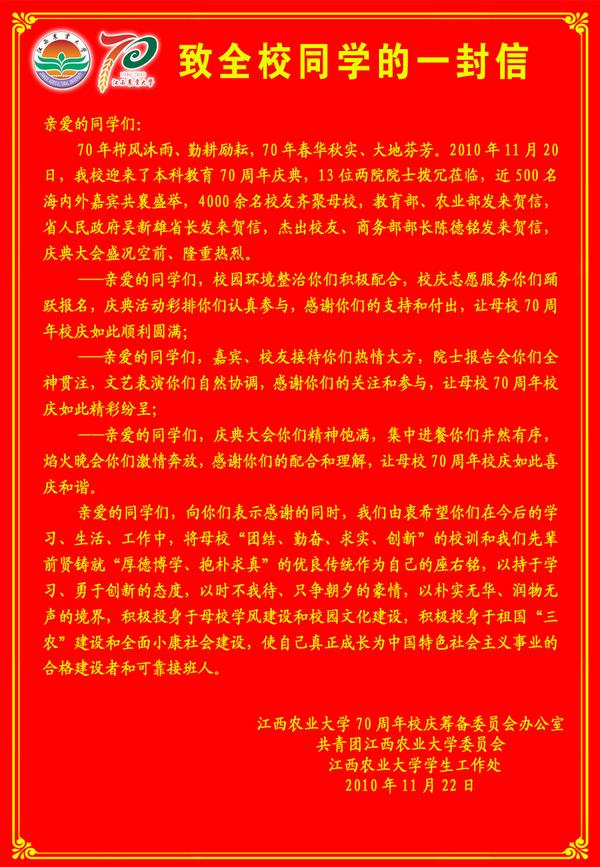 校慶辦、團(tuán)委、學(xué)工處:致全校同學(xué)的一封信