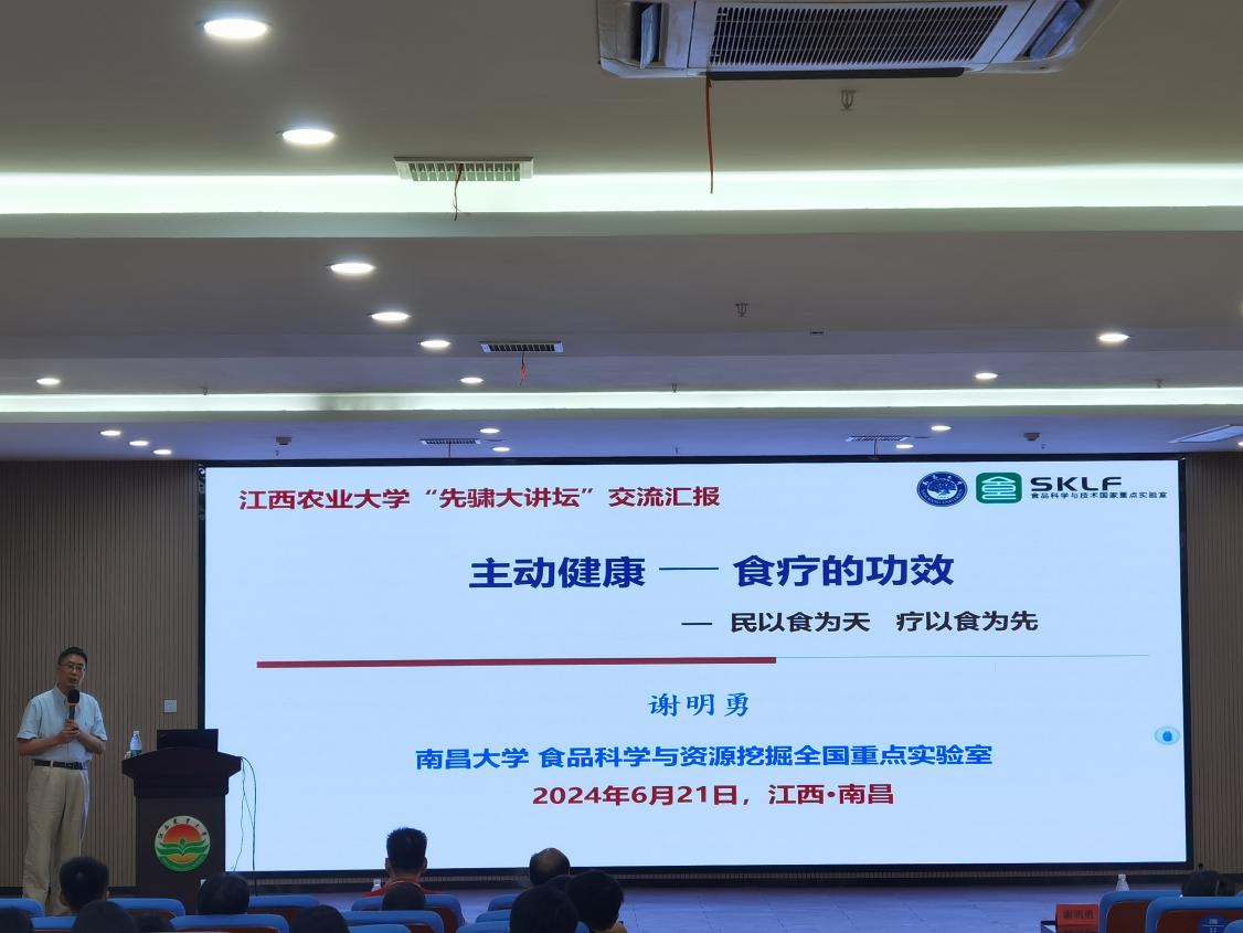 謝明勇以“主動健康——食療的功效”為題,從知識、科學、技術三個角度,講述主動健康面臨的機遇與挑戰、食療健康對主動健康的重要性及國際健康食品發展的大趨向,結合“猴菇餅干”“猴菇米稀”“益生菌發酵果蔬原漿”“發酵果蔬飲料”等“養胃”食療系列健康產品創制,系統闡明食療食品的健康效應機理、食療食品配方優化設計等。最后,謝明勇指出大力發展“食藥同源”食療產業應該成為實施“健康中國”戰略和“主動健康”模式的重要途徑,“食藥同源”食療產品將為主動健康“發光發熱”。