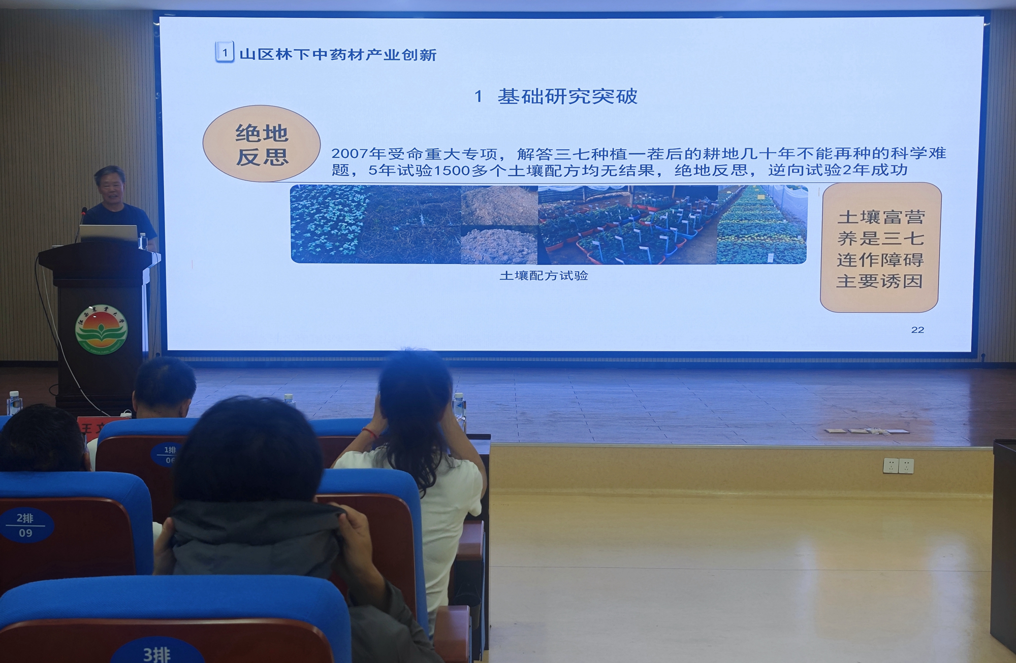 朱有勇以“一個‘農民院士’的科研經歷”為主題,圍繞三條主線“啟蒙:一道不會回答的考題;求索:一條艱辛探索的道路;回歸:一篇寫在大地上的論文”,生動講述了自身從農民到“農民”院士的科研經歷,分享了從脫貧攻堅再到糧食安全主戰場上如何靠科技創新,把科研工作轉化為服務百姓看得見的生產力,形成了“生物多樣性:山區林下中藥材;生境多樣性:河谷冬季馬鈴薯;遺傳多樣性:半山區旱地水稻”等特色科技成果和成果轉化成功案例。最后,朱有勇以“人倦了,天遠了,唯有山水相依。守候著那束透過紅城的梯田之光”,鼓勵廣大青年科技工作者和大學生,要堅定理想信念,持之以恒,守住科研工作者的詩和遠方。