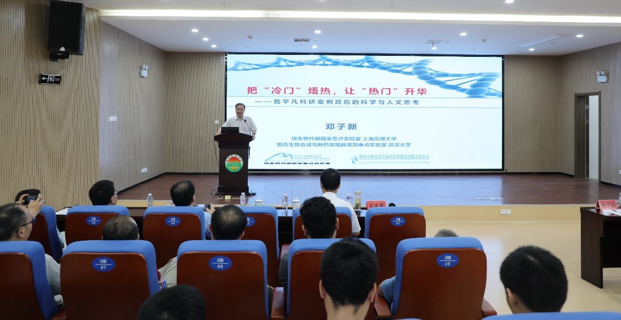 鄧子新以“把‘冷門’焐熱,讓‘熱門’升華——我平凡科研案例背后的科學與人文思考”為題,緊密結合自身的科研歷程,以DNA硫修飾機制的發現為例,分享了如何勇闖無人區將‘冷門’焐熱;以“南昌霉素”、“井岡霉素”和“殺念菌素”等研究工作為例,分享了如何通過求“延伸”、找“盲點”、挖“瑕疵”讓‘熱門’升華。聚焦前沿技術,分享了航空燃油和維生素E的合成工藝、微生物發酵-化學合成相結合生產圓柚酮技術等。圍繞人才培養,鄧子新勉勵青年教師和學生朝著健康的學術方向發展,關注“冷門”研究,以“游泳”為例子,鼓勵青年科研人員要勇闖深水區,不斷提高在未知知識海洋發現新理論的本領。