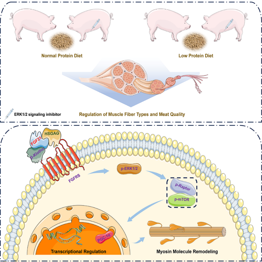 豬肉作為我國(guó)主要的肉類消費(fèi)食品,是人們主要的動(dòng)物蛋白質(zhì)來(lái)源,但豬肉品質(zhì)和消費(fèi)者的預(yù)期仍有較大差距。采用低蛋白日糧技術(shù)不僅節(jié)約蛋白質(zhì)飼料資源,還是生產(chǎn)優(yōu)質(zhì)豬肉產(chǎn)品、實(shí)現(xiàn)養(yǎng)豬業(yè)高效能的重要途徑。因此,探索低蛋白日糧調(diào)節(jié)肌肉生物學(xué)特性的分子機(jī)制,特別是對(duì)機(jī)體內(nèi)分泌信號(hào)介導(dǎo)的肌纖維發(fā)育和肌纖維類型轉(zhuǎn)化機(jī)制研究十分重要,對(duì)科學(xué)制定低蛋白日糧的營(yíng)養(yǎng)策略,推動(dòng)豬肉品質(zhì)精準(zhǔn)調(diào)控具有重要的意義。研究團(tuán)隊(duì)采用分子生物學(xué)和肌肉代謝組學(xué)技術(shù),以日糧蛋白限制的手段誘導(dǎo)仔豬機(jī)體FGF21的快速表達(dá)和分泌,并通過(guò)注射ERK1/2特異性抑制劑,探討了FGF21作為內(nèi)分泌信號(hào)影響豬肉質(zhì)特性的分子機(jī)制。研究發(fā)現(xiàn)豬骨骼肌感知FGF21信號(hào),通過(guò)激活ERK1/2,誘導(dǎo)mTORC1復(fù)合體中Raptor磷酸化,導(dǎo)致mTORC1信號(hào)通路活化,從而調(diào)控PGC-1α轉(zhuǎn)錄活性和骨骼肌代謝功能,促進(jìn)慢速氧化性肌纖維生成。本研究結(jié)果明確了FGF21是介導(dǎo)低蛋白日糧促進(jìn)豬氧化型肌纖維生成的關(guān)鍵內(nèi)分泌信號(hào)之一,為動(dòng)物生產(chǎn)上科學(xué)研發(fā)豬肉品質(zhì)調(diào)控技術(shù)提供了理論支撐。