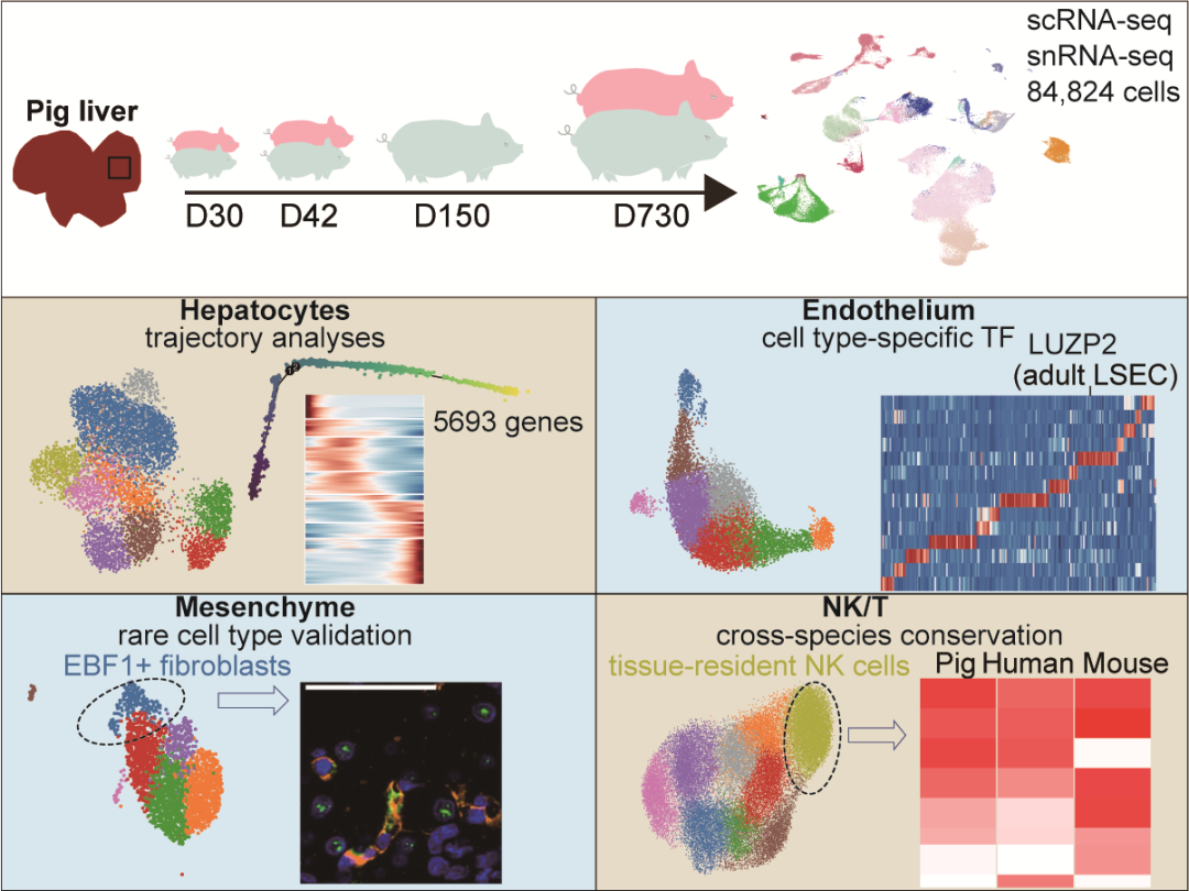 對健康家豬、雌性以及雄性個體不同發育階段肝臟單細胞及單核轉錄組的系統研究,不僅對于提高家豬生產效率及飼料利用效率具有重要意義,同時,也為人類健康肝臟不同發育階段的單細胞組成與功能提供了重要參考。