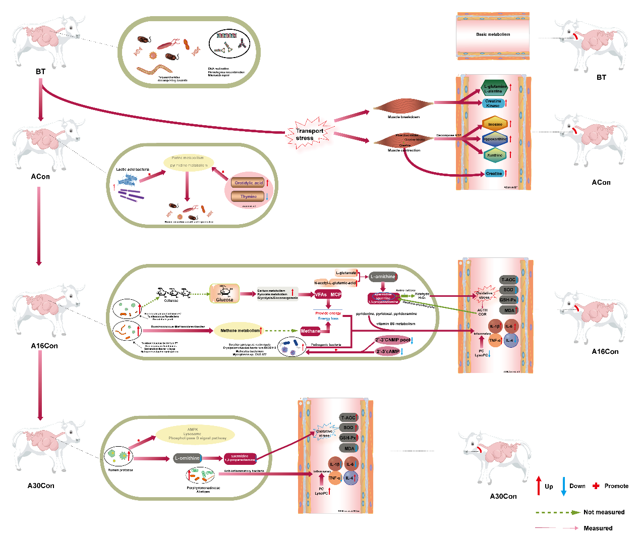 (3)成功構建了瘤胃微生物-宿主互作網絡,首次揭示了新進牛生長受阻機制。作者將差異瘤胃細菌與血清應激指標、瘤胃差異代謝物及血清差異代謝物進行Spearman相關性分析,并結合瘤胃微生物組、瘤胃代謝組、血清代謝組變化規律,研究發現新進牛到場后第16天,瘤胃中產甲烷菌和致病菌基因豐度顯著提升,多胺產生增多誘導機體氧化應激,瘤胃VB6和血清PC/LysoPC含量下降,免疫功能破壞(圖2)。具體結果如下:Saccharopolyspora_rectivirgula以及三個柔膜菌(Erysipelotrichaceae_bacterium_NK3D112,Mollicutes_bacterium, Mycoplasma_sp_CAG_877)與血清應激指標(COR,ACTH以及TNF-α)以及瘤胃代謝產物(L-Ornithine,Spermine和Spermidine)呈顯著正相關,而與PC和LysoPC類化合物呈顯著負相關,表明新進牛在運輸后第16天應激反應加劇與病原菌增多有密切關系。此外,在運輸后第16天盡管Ruminococcaceae_bacterium_P7,Ruminococcus_flavefaciens和Prevotella_bryantii豐度顯著升高促進了VFAs和MCP的合成,但同時甲烷代謝增強,造成能量損失;并且瘤胃2',3'環磷酸腺苷(2',3'-cAMP;生物膜合成的第二信使)和相關核苷酸代謝產物(cAMP,cGMP和adenine)含量的降低為病原菌繁殖提供有利條件,二者共同導致宿主發生炎癥反應。另外還有多胺產生增多誘導機體氧化應激。相反,在運輸后第30天,瘤胃細菌Prophyromonadaceae_bacterium,Alistipes_sp_CAG_345,Alistipes_sp_CAG_514的豐度顯著升高,三者是抗炎細菌,其豐度升高是緩解機體炎癥的一種可能因素。此外,在這一時期瘤胃原蟲的增加,其降解精氨酸產生多胺的速度遠遠低于細菌,因此這一時期多胺水平的下降,機體氧化應激得到緩解,與瘤胃原蟲豐度增加有關。