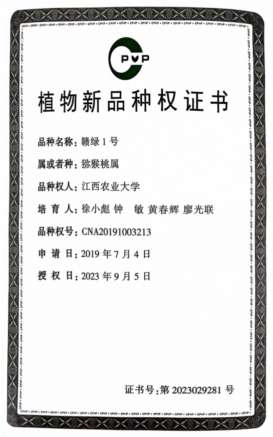 日前,我校農(nóng)學(xué)院徐小彪教授團隊在獼猴桃新品種選育與抗壞血酸調(diào)控機制研究方面取得新進展。團隊選育的毛花獼猴桃‘贛綠1號’(品權(quán)號CNA20191003213)和中華獼猴桃‘贛金2號’(品權(quán)號:CNA20201000528)獲國家植物新品種權(quán)證書。‘贛綠1號’果實可溶性固形物含量(19.40%,最高達22.2%)顯著性高于國內(nèi)外已有報道的毛花獼猴桃品種;‘贛金2號’為單花結(jié)果為主的中熟四倍體品種,果肉金黃,肉質(zhì)細(xì)嫩。