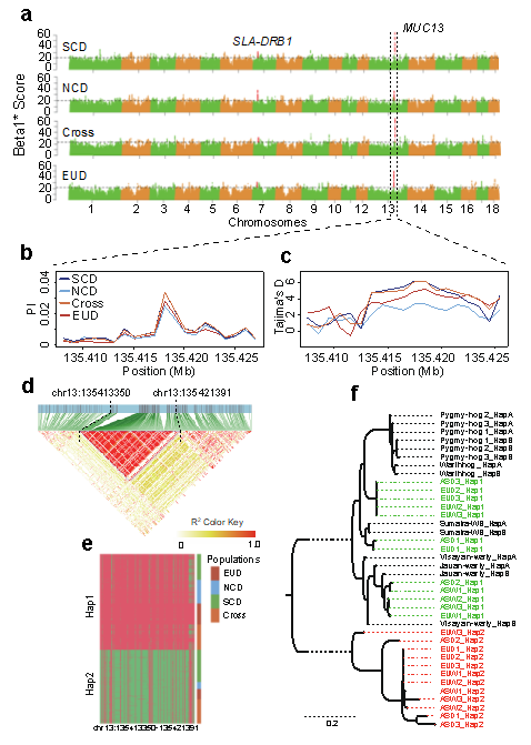 (3)挖掘了平衡選擇和正選擇的候選基因并闡明了其受選擇區域影響的表型及潛在機理。多品種、大樣本、高質量的豬參考單倍型庫還是進化選擇分析的重要參考。本項目在中國東南家豬、中國西北家豬、雜交豬和歐洲家豬的平衡選擇分析中發現一個平衡選擇基因MUC13,該基因在所有豬種中只存在兩種單倍型。為了進一步解析該基因平衡選擇的表型,項目利用前期構建的F2資源群體對300多項與生殖、肉質、血液、細胞、生長和免疫性狀相關的表型進行掃描,結果發現MUC13的單倍型1個體表現為仔豬腹瀉表型,而生長相關性狀則顯著增長,單倍型2個體表現為抗仔豬腹瀉表型,但生長相關性狀較單倍型1個體緩慢。該結果揭示了MUC13基因受平衡選擇的潛在機理,提示廣大動物育種工作者在育種過程中應科學選配受平衡選擇的基因的個體。另一方面,由于研究中所涉及的豬種在體型上差異巨大,為了探究體型差異背后的遺傳因素,作者針對豬體型大小進行了正向選擇分析。結果鑒定到36個影響豬體型大小的候選基因,其中的6個已證實與畜禽體型大小相關。除此之外,作者還鑒定到一個影響體型大小的新候選基因NPR3,該基因不僅與人類身高和骨骼框架大小有關,還會導致小鼠骨骼的過度生長,是一個強候選基因,可為豬遺傳育種提供重要借鑒。
