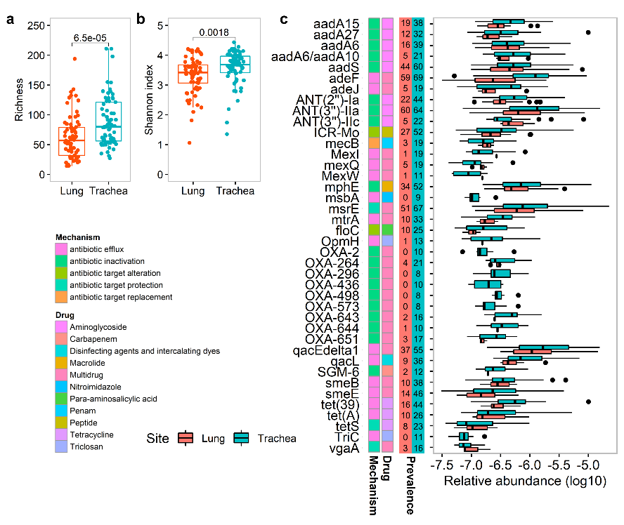 圖:豬肺部和氣管抗生素抗性基因組成比較