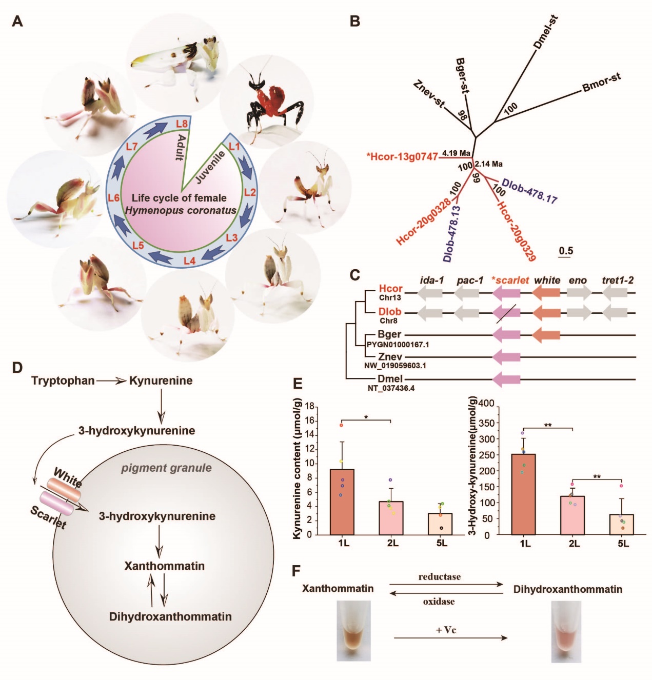 該研究利用比較基因組和生化手段,揭示了蘭花螳螂發育過程中獨特的顏色變化:一齡幼蟲呈現紅黑色,模仿有毒的獵蝽,采取警戒色的生存策略;從二齡幼蟲階段,開始模仿花朵,呈現白色或粉色。基因家族分析顯示,ABC超家族中Scarlet與White在蘭花螳螂中顯著擴張,兩者可結合形成異二聚體,將3-羥基犬尿氨酸運輸到色素顆粒中合成眼黃素。生化實驗和高效液相色譜測定分析進一步證實了眼黃素是蘭花螳螂顏色偽裝的關鍵色素。