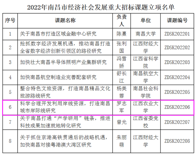 近日,2022年南昌市經(jīng)濟(jì)社會(huì)發(fā)展重大招標(biāo)課題正式揭標(biāo),由我校國(guó)土學(xué)院教授羅志軍博士作為負(fù)責(zé)人申報(bào)的課題《科學(xué)合理開發(fā)利用岸線資源,打造南昌城市岸際線研究》,成功獲批立項(xiàng)。