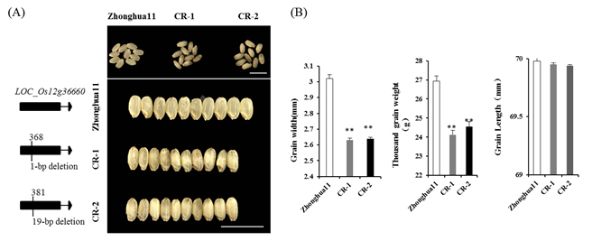 圖2 CRISPR/ cas9誘導的LOC_Os12g36660突變體及其表型