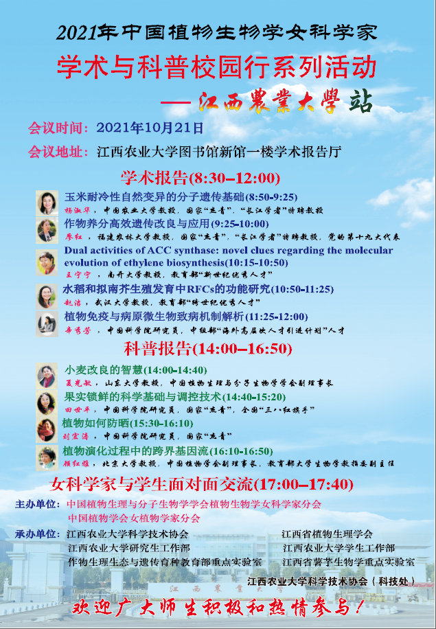 學(xué)術(shù)報告預(yù)告:2021年中國植物生物學(xué)女科學(xué)家學(xué)術(shù)與科普校園行系列活動—江西農(nóng)業(yè)大學(xué)站