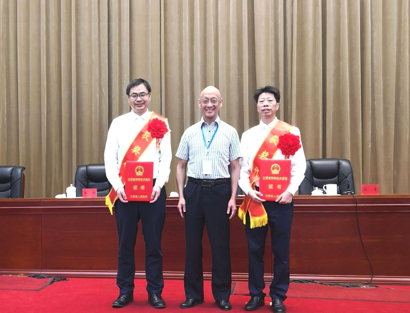 2020年度,我校共獲5項科技成果獎勵。其中,科技處處長游金明教授牽頭主持完成的項目“仔豬腸道屏障功能及機體免疫調控關鍵技術研發與應用”、林學院副院長陳伏生教授牽頭主持完成的項目“丘陵山區杉竹林地力提升與高產高效高值協同培育技術集成及示范”均榮獲江西省科技進步獎一等獎;我校作為參與單位完成的科技成果分別獲科技進步獎三等獎2項、自然科學獎三等獎1項。江西省科技進步獎一等獎獲得者游金明和陳伏生兩位教授作為獲獎代表接受省領導和中科院院士頒獎。