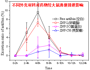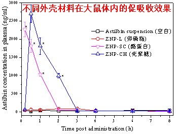黃酮類物質(zhì)是食品中重要的功能成分,有多種健康促進(jìn)作用。但黃酮很難吸收,且在體內(nèi)經(jīng)I相和II相代謝可形成十余種代謝產(chǎn)物(如甲基化、葡萄糖醛酸化、硫酸化等)。復(fù)雜的代謝過程使得很難對ZNP促進(jìn)黃酮體內(nèi)吸收效果進(jìn)行準(zhǔn)確量化。課題組發(fā)現(xiàn),由于特殊的鼠李糖結(jié)構(gòu),黃酮落新婦苷(龜苓膏中主要活性成分)在大鼠體內(nèi)的代謝非常獨(dú)特,幾乎不發(fā)生轉(zhuǎn)化而主要以本體的形式被吸收和血液輸送。因此,落新婦苷是一種很好的模式黃酮用于定量不同口服給藥載體的體內(nèi)促吸收效果。在此基礎(chǔ)上,課題組分別以卵磷脂、殼聚糖和酪蛋白為外殼材料,設(shè)計(jì)了三種不同的負(fù)載落新婦苷的ZNP,研究外殼材料對ZNP體內(nèi)外性質(zhì)的影響。結(jié)果表明三種殼材料都可顯著增加ZNP體外穩(wěn)定性,但體內(nèi)促吸收效果差異巨大。殼聚糖、酪蛋白和卵磷脂促進(jìn)落新婦苷體內(nèi)吸收倍數(shù)分別為18.2,9.3和1.89倍。其主要機(jī)制為殼聚糖和酪蛋白具有腸道黏附性能,可以顯著減少和推遲糞便對藥物的排泄;而卵磷脂沒有該性能。殼聚糖因?yàn)閹в姓姾桑c帶負(fù)電的黏液蛋白結(jié)合能力比酪蛋白更強(qiáng);但殼聚糖作為殼材料很容易使ZNP粒徑過度增大,弱化滲透黏液層能力,從而減弱體內(nèi)促吸收效果。