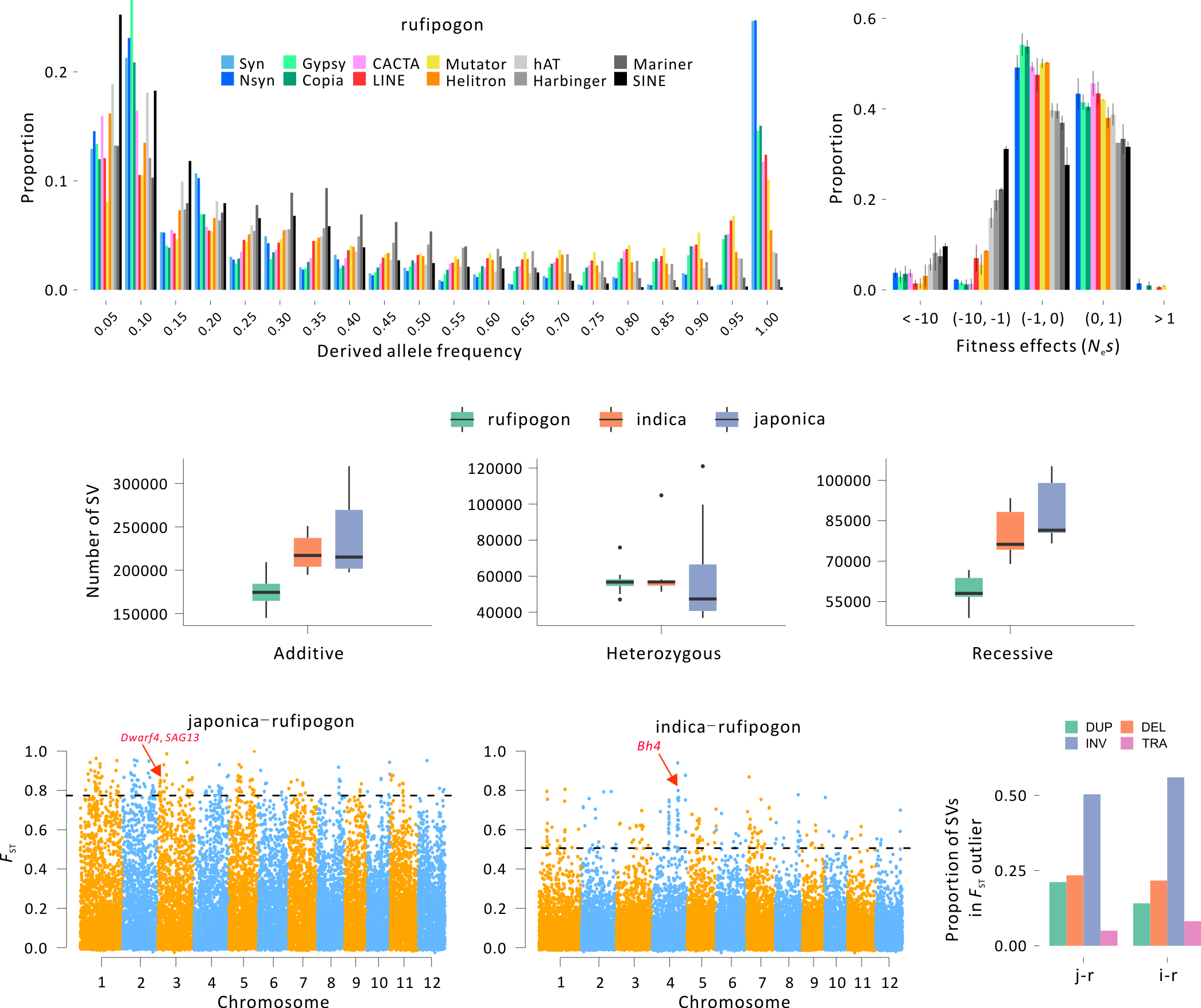 結(jié)構(gòu)變異作為基因組變異的重要組成部分,對(duì)植物表型變異產(chǎn)生了巨大的影響,并在生產(chǎn)實(shí)踐中得到了廣泛的應(yīng)用,然而從群體基因組水平上深度揭示其變化規(guī)律的研究甚少。該文以亞洲栽培稻Oryza sativa與其野生祖先種O. rufipogon為研究對(duì)象,基于基因組重測(cè)序數(shù)據(jù)(347份材料),以及三代和組裝基因組數(shù)據(jù),鑒定了水稻群體基因組水平上的結(jié)構(gòu)變異,包括倒位、重復(fù)、刪除、易位,以及轉(zhuǎn)座元件;通過位點(diǎn)頻譜變化規(guī)律和遺傳負(fù)荷分析,揭示結(jié)構(gòu)變異作用于水稻的馴化成本(domestication cost),并主要以有害突變的形式存在,尤其是倒位和轉(zhuǎn)座元件SINE和mariner家族;此外,通過比較基因組分析發(fā)現(xiàn),在水稻馴化過程中通過結(jié)構(gòu)變異獲得和丟失數(shù)百個(gè)基因,在一些顯著分化的結(jié)構(gòu)變異中還富集了一批與重要的農(nóng)藝性狀相關(guān)的基因。該研究不僅對(duì)水稻遺傳育種具有重要的指導(dǎo)意義,同時(shí)也為植物馴化相關(guān)的研究,以及植物群體進(jìn)化基因組學(xué)研究提供新的研究思路。