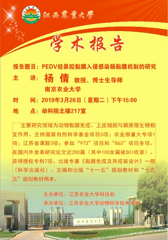 學術報告預告:PEDV經鼻腔黏膜入侵感染腸黏膜機制的研究