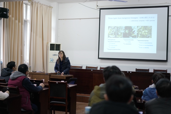 報告中,施蘇華教授從基因組層面對紅樹植物的起源和基因組進化、紅樹植物的物種形成以及紅樹植物應對全球氣候變化三個方面進行了闡述。施教授的報告深入淺出,娓娓道來,用長期研究的成果,系統地闡述了紅樹植物的起源、現狀和未來。聆聽報告的師生踴躍發言,互動交流熱烈。