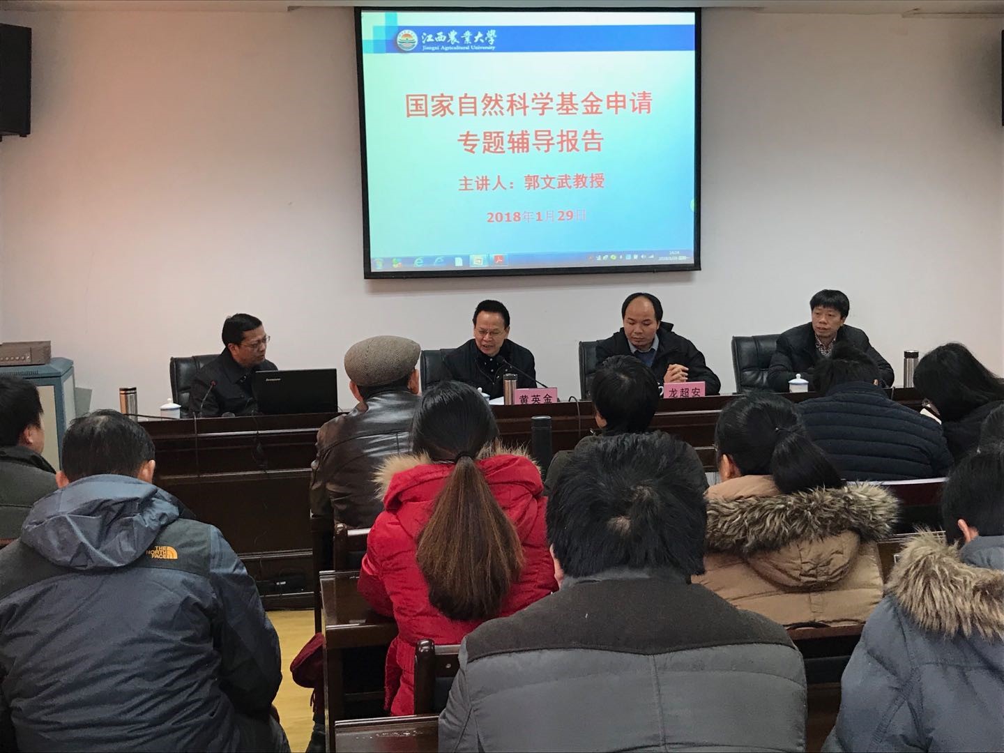 1月29日下午,為進一步推進2018年度國家自然科學基金項目的組織申報工作,科技處邀請國家杰出青年基金獲得者、華中農業大學博士生導師郭文武教授來校作“國家自然科學基金申請”專題輔導報告。校長助理龍超安、科技處負責人及相關學院的老師參會。報告會由副校長黃英金主持。