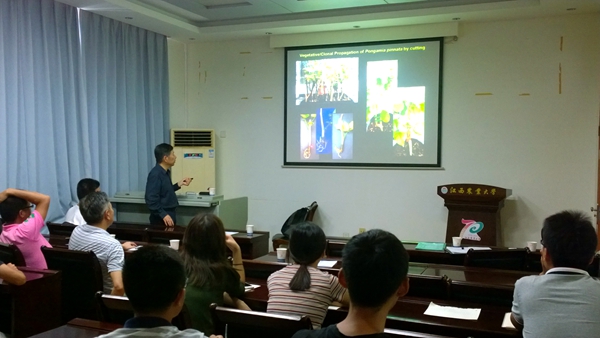 江研究員以“模式豆科植物百脈根在結瘤和根系發育過程中激素之間的相互作用”和“利用豆科樹種水黃皮作為生物燃料的展望”為主題,以沈善炯先生等為例,介紹了“什么是一位好的科學家”;隨后他從概念入手,系統分析研究領域的內容,詳盡介紹了相關領域的研究進展及研究成果及如何去做研究,師生受益匪淺。江研究員與師生們進行了真誠、熱烈的交流。整場報告內容豐富、深入淺出、視野開闊,在師生中引起了強烈的反響。