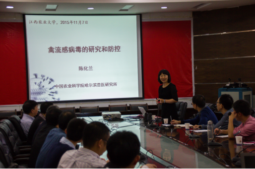 11月7日上午,國家杰出青年基金獲得者、農(nóng)業(yè)部動(dòng)物流感重點(diǎn)開放實(shí)驗(yàn)室主任、中國農(nóng)業(yè)科學(xué)院哈爾濱獸醫(yī)研究所陳化蘭研究員應(yīng)邀來校作題為“禽流感病毒的研究與防控”的學(xué)術(shù)報(bào)告。報(bào)告會由副校長黃英金主持。