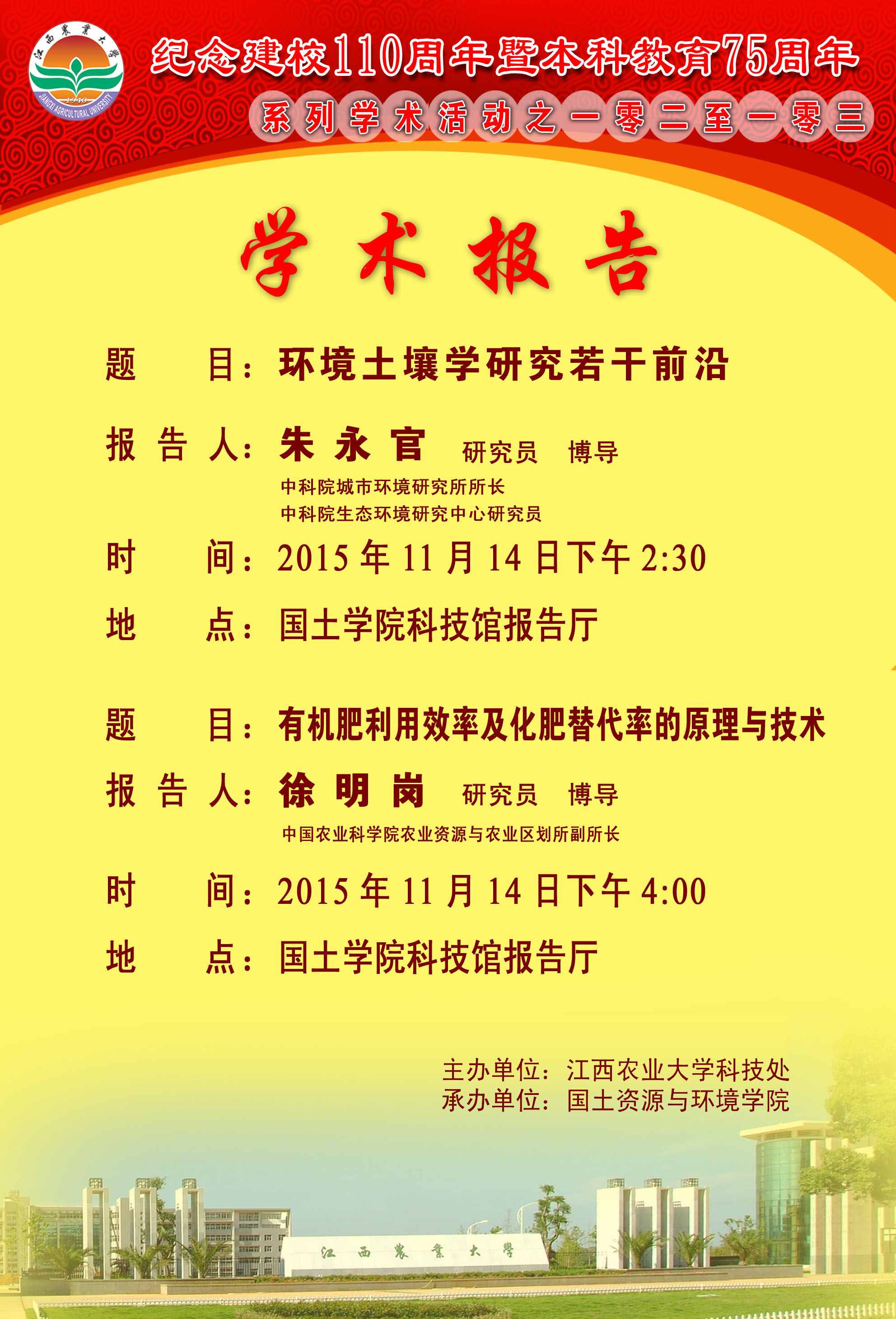 學(xué)術(shù)報(bào)告海報(bào):1. 環(huán)境土壤學(xué)研究若干前沿 2. 有機(jī)肥利用效率及化肥替代率的原理與技術(shù)