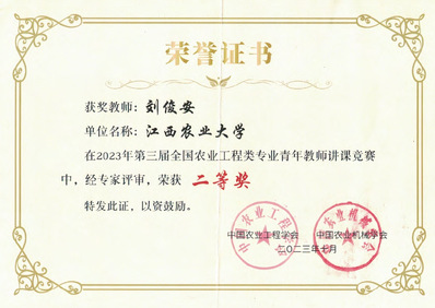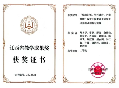 學院以新工科、新農(nóng)科建設(shè)為引領(lǐng),帶動學科專業(yè)結(jié)構(gòu)調(diào)整優(yōu)化和內(nèi)涵提升,做強優(yōu)勢學科專業(yè)。農(nóng)業(yè)機械化及其自動化專業(yè)先后獲評江西省一流特色專業(yè)、江西省普通高等學校本科五星級專業(yè),《農(nóng)業(yè)機械學》獲評江西省一流本科線下課程;獲省級線上教學優(yōu)秀課程1門,省級虛擬仿真實驗項目1項。學院研究生教育創(chuàng)新基地被全國農(nóng)業(yè)專業(yè)學位研究生教育指導委會評為“全國農(nóng)業(yè)碩士專業(yè)學位研究生實踐教育特色基地”,驗收通過“江西省機械工程研究生聯(lián)合培養(yǎng)基地(第三批)”。持續(xù)完善科技創(chuàng)新體制,提升創(chuàng)新創(chuàng)業(yè)能力。五年來,學院獲批國家重點研發(fā)計劃項目、國家自然科學基金項目、農(nóng)業(yè)農(nóng)村部全程機械化科研基地項目等25項,總立項經(jīng)費超過6500余萬元。獲江西省科學技術(shù)進步獎一等獎、全國農(nóng)牧漁業(yè)豐收農(nóng)業(yè)技術(shù)推廣合作獎等省部級科技獎勵4項。持續(xù)深化“3332”創(chuàng)新實踐工作項目,創(chuàng)新創(chuàng)業(yè)和學科專業(yè)競賽取得好成績。五年來,獲省級以上創(chuàng)新創(chuàng)業(yè)、學科競賽獎勵200余項,其中,“挑戰(zhàn)杯”大學生學術(shù)科技競賽、國際大學生智能農(nóng)業(yè)裝備創(chuàng)新大賽、中國高校智能機器人創(chuàng)意大賽、全國大學生物聯(lián)網(wǎng)設(shè)計競賽等國家級獎項40余項。