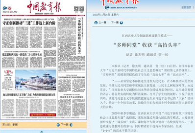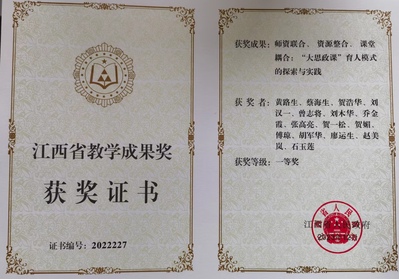 多措并舉推動(dòng)思政課教學(xué)提質(zhì)增效。學(xué)院堅(jiān)持常態(tài)化集體備課、賽課、評(píng)課,積極探索構(gòu)建“一課多師”“雙師同堂”“師生同堂”和“大班授課、小班研討”等形式,深入開(kāi)展思政課教師“一線(xiàn)課堂”活動(dòng),分層分類(lèi)開(kāi)展實(shí)踐教學(xué),打出思政課教學(xué)提質(zhì)增效的“組合拳”。2022年11月,中國(guó)教育報(bào)頭版以《江西農(nóng)業(yè)大學(xué)創(chuàng)新思政課教學(xué)模式——“多師同堂”收獲“高抬頭率”》對(duì)學(xué)校思政課教學(xué)改革創(chuàng)新進(jìn)行了報(bào)道。2019年-2023年,學(xué)校獲首屆全國(guó)高校思想政治理論課教學(xué)展示活動(dòng)二等獎(jiǎng)1項(xiàng),獲全省思政課教學(xué)、創(chuàng)新教學(xué)大賽等三等獎(jiǎng)及以上獎(jiǎng)勵(lì)14項(xiàng)。2024年獲批全省高校思政課“雙師同堂”示范課堂2門(mén)、“師生同堂”示范課堂1門(mén)。