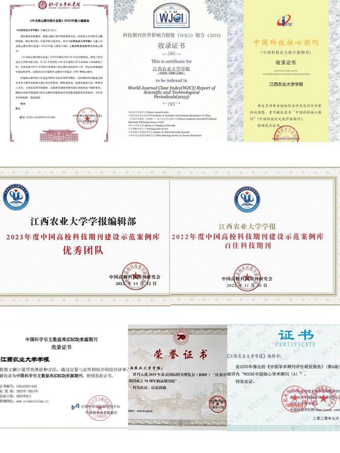 《江西農(nóng)業(yè)大學(xué)學(xué)報(bào)》辦刊質(zhì)量取得歷史性突破 繼2019年首次入選《中國(guó)科學(xué)引文數(shù)據(jù)庫(CSCD)來源期刊》核心庫后,2021年版、2023年版連續(xù)入選,成為江西省中文期刊唯一入選者,在高質(zhì)量發(fā)展上取得重大突破。2018年、2020年、2022年連續(xù)3次榮獲中國(guó)高校百佳科技期刊。2019年榮獲中國(guó)高??萍计诳皟?yōu)秀團(tuán)隊(duì)”稱號(hào)。2019年,入選中國(guó)期刊協(xié)會(huì)主辦的“慶祝中華人民共和國(guó)成立70周年精品期刊展”第一主題“新中國(guó)獲獎(jiǎng)期刊”展出期刊。2018年以來連續(xù)6次入選中國(guó)科技核心期刊、連續(xù)3次入選北大《中文核心期刊要目總覽》,也是自科學(xué)報(bào)連續(xù)7次入選中文核心期刊要目“綜合性農(nóng)業(yè)科學(xué)”類核心期刊。2020年首次、2021年連續(xù)列入農(nóng)林領(lǐng)域我國(guó)高質(zhì)量科技期刊分級(jí)目錄入選期刊,成為111種我國(guó)農(nóng)林領(lǐng)域高質(zhì)量科技期刊之一。2020年入選RCCSE中國(guó)核心學(xué)術(shù)期刊。2021年入選“中國(guó)高??萍计诳ㄔO(shè)示范案例庫·團(tuán)隊(duì)案例”,入選“中國(guó)農(nóng)林核心期刊”,首次入選美國(guó)EBSCO學(xué)術(shù)數(shù)據(jù)庫,入選“中文精品學(xué)術(shù)期刊外文版數(shù)字出版工程”、榮獲“2021年度中國(guó)農(nóng)業(yè)期刊領(lǐng)軍期刊”稱號(hào)、第六屆江西省優(yōu)秀期刊一等獎(jiǎng)、第七屆華東地區(qū)優(yōu)秀期刊。2021年、2022年、2023年連續(xù)3次入選《世界期刊影響力指數(shù)(WJCI)報(bào)告》,2023年版位列全球農(nóng)業(yè)科學(xué)綜合類150種科技期刊中第62位,在我國(guó)農(nóng)業(yè)高校農(nóng)業(yè)科學(xué)綜合類科技期刊中排名第7位。2022年、2023年連續(xù)2次入選中國(guó)科學(xué)技術(shù)協(xié)會(huì)實(shí)施的“科技期刊雙語傳播工程”。2023年度全省高校學(xué)術(shù)期刊質(zhì)量檢查與評(píng)估中被評(píng)為“江西省高校權(quán)威科技期刊”。根據(jù)《中國(guó)學(xué)術(shù)期刊影響因子年報(bào)(自然科學(xué))》年報(bào),本刊復(fù)合影響因子和綜合影響因子逐年上升,2019年版年報(bào)中復(fù)合影響因子突破1,2022年版突破1.5,2023年版為1.906,2023年版復(fù)合影響因子較2018年版增長(zhǎng)96.9%。