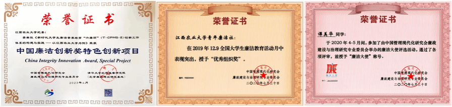 涵養廉潔文化,精心厚植廉潔沃土。校紀委注重正本清源、固本培元,不斷強化新時代校園廉潔文化建設。堅持創新工作機制,大學生廉潔教育“六廉環”工作體系入圍第三屆“中國廉潔創新獎”特色項目,系全省唯一獲評單位。常態化舉辦廉潔文化作品展和主題征文活動,形成校園濃厚崇廉尚潔氛圍,選送作品在第五屆全國“玉琮杯”微廉政電影大賽中取得突破性成績,獲銀獎1個,銅獎2個;在“加強廉潔文化建設 全面建設勤廉江西”主題征文中榮獲優秀獎一篇。持續抓好青年廉潔社的指導工作,舉辦“廉潔新星”“我為廉潔代言”等活動,培育學校廉潔新風,厚植廉潔沃土。