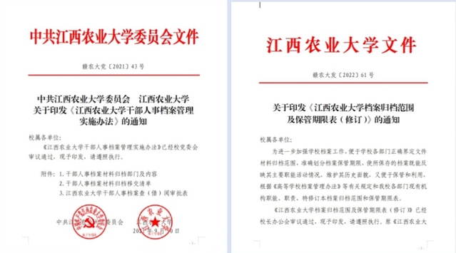 以貫徹實施新修訂的檔案法為契機,檔案依法治理效能得到新提升。學校將檔案法列入黨委中心組學習內容,邀請省檔案局領導到學校宣講新修訂的檔案法,在全校舉辦了檔案法專題宣傳展。學校建立了檔案工作委員會和校領導分管檔案工作的頂層架構、校屬各單位領導分管檔案工作、檔案館專職檔案員和各單位兼職檔案員的工作隊伍,形成了一套自上而下、專兼結合的檔案工作組織體系,為學校檔案工作全面可持續發展提供堅強組織保證。學校出臺了《江西農業大學檔案歸檔范圍及保管期限表(修訂)》《江西農業大學歸檔文件整理規定》《江西農業大學干部人事檔案管理實施辦法》等一系列制度。同時,根據檔案工作新形勢、新要求,修訂完善了涵蓋檔案收集、利用、保密、保管等各項工作制度,為優化檔案治理體系,提升檔案治理效能提供了制度保障。