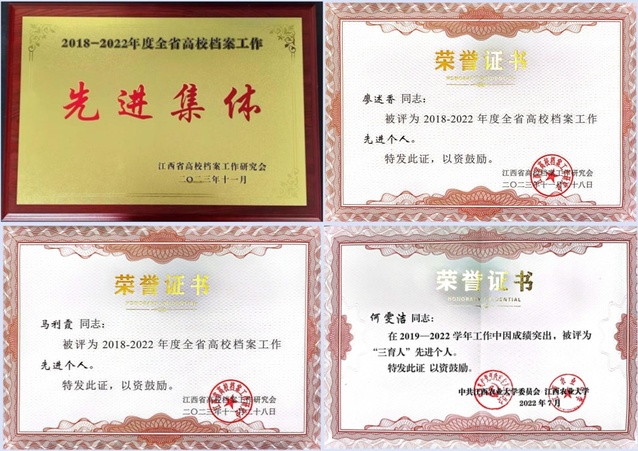 檔案館黨支部始終堅持以習近平新時代中國特色社會主義思想為指導,全面貫徹黨的二十大精神和習近平總書記考察江西重要講話精神,始終堅持“檔案工作姓黨”的第一原則,旗幟鮮明加強政治引領。聚焦“蘭臺匠心”金扁擔黨建品牌建設,以“黨建+檔建”為基本思路,立足部門職能特點,將黨建工作與檔案業務、服務育人有機融合、有序推進,服務學校事業發展、解決師生和校友急難愁盼,圍繞落實立德樹人根本任務,建設成為檔案資政、服務育人的基層黨組織,充分發揮支部戰斗堡壘和黨員先鋒模范作用,推動黨建引領檔案事業高質量發展。2021年,檔案館黨支部年終考核為“五星黨支部”。2022年,何雯潔榮獲學校“三育人”先進個人稱號。2023年,檔案館榮獲“全省高校檔案工作先進集體”稱號,廖述香、馬利霞榮獲“全省高校檔案工作先進個人”稱號。