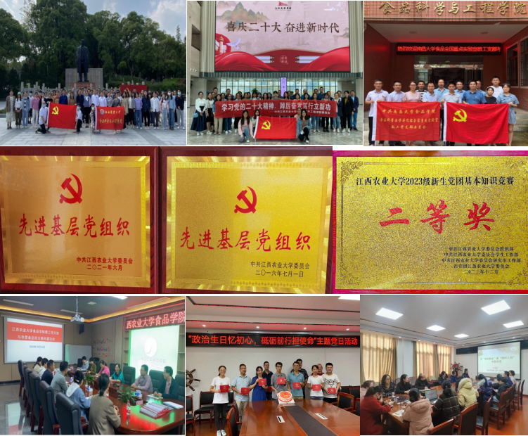 堅持黨建引領,推進融合發(fā)展。學院黨委切實履行管黨治黨主體責任,全面貫徹新時代黨的建設總要求,深入開展“不忘初心、牢記使命”、黨史學習教育和學習貫徹習近平新時代中國特色社會主義思想主題教育。以黨建“三化”建設為抓手,促進黨建工作與中心工作深度融合,打造具有學院特色的“金扁擔”黨建品牌“紅焙筑夢”,推動黨建與學科發(fā)展、人才培養(yǎng)、學風建設深度融合。學院“雙帶頭人”擔任教工黨支部書記比例達100%,建立完善學院黨委班子成員、黨支部支委聯系普通黨員、黨員聯系群眾“雙聯系”制度,及時掌握師生動態(tài),著力解決師生的“急難愁盼”;通過基層黨支部志愿服務活動開展科技服務,學院黨員教師每年進行科技服務不低于50人次,為江西地方經濟發(fā)展貢獻力量,基層黨組織的戰(zhàn)斗堡壘作用發(fā)揮更明顯,黨員先鋒模范作用發(fā)揮更突出。學院先后榮獲先進基層黨組織、校新生黨團知識基本知識競賽一等獎等成績。