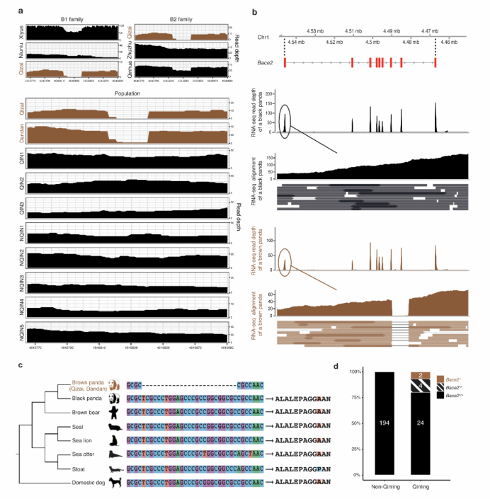 為驗證Bace2基因結構的完整性,以及25bp缺失是否在棕色大熊貓中真實存在,研究團隊檢查了所有重測序個體在該區(qū)段的測序深度,并利用轉錄組測序數據確認了Bace2基因結構的完整性,同時在RNA水平驗證了該突變在棕色大熊貓中真實存在。為進一步探究該缺失突變與棕色變異關聯(lián)的可靠性,研究團隊對其它192只秦嶺、非秦嶺、或雜交的黑白大熊貓Bace2基因的該缺失變異區(qū)段進行PCR和Sanger測序,結合35只全基因組重測序個體共227只大熊貓個體,最終確認僅兩只棕色大熊貓存在純合25bp缺失,四只秦嶺黑白色大熊貓和圈養(yǎng)大熊貓秦華為雜合子,而其它黑白色大熊貓均為野生型純合子。
