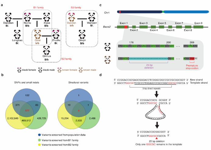 為揭示棕色大熊貓背后的遺傳模式與分子機制,研究人員基于在佛坪保護區(qū)及其周邊區(qū)域的157只大熊貓的微衛(wèi)星基因分型數據及圈養(yǎng)繁育信息,構建出棕色大熊貓“七仔”的兩個家系,發(fā)現七仔的父母及后代均為黑白毛色,結合七仔和已知的丹丹家系,推斷該棕色表型是由常染色體隱性遺傳模式控制。進一步,研究人員利用三代測序技術、Bionano、Hi-C等測序技術對七仔的父親“喜悅”的基因組進行了從頭組裝,構建了其染色體水平的基因組。以該基因組作為參考,結合七仔、丹丹、七仔家系的四只黑色大熊貓以及其它秦嶺和非秦嶺地區(qū)的29只野生大熊貓,共35只熊貓個體的高深度重測序數據,研究人員在大熊貓常染色體上鑒定出了大量的SNPs、small indels和結構變異。經過種群和家系水平的變異篩選,棕色大熊貓位于1號染色體上Bace2基因第一個外顯子上的25bp純合缺失突變最可能是其毛色變異的遺傳基礎。