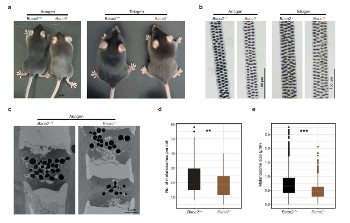 為驗證大熊貓Bace2基因的25bp缺失對毛色表型的影響,研究人員使用CRISPR?Cas9基因編輯技術在C57BL/6J品系小鼠中構建了同源區(qū)段敲除的小鼠模型,發(fā)現所有Bace2-/-小鼠的毛色淺于野生型毛色。顯微觀察發(fā)現,相較于1月齡生長期,4月齡休止期的小鼠毛發(fā)中色素缺乏的情況更為顯著。對小鼠背部毛發(fā)進行透射電鏡觀察并統(tǒng)計單個細胞內的黑素體數量和截面積,Bace2-/-小鼠出現與棕色大熊貓相似的黑素體數量顯著減少和截面積顯著減小。綜合以上所有信息,研究人員推斷Bace2基因的25bp缺失最可能是導致大熊貓出現棕白色毛色變異的原因,這也是首次報道Bace2基因突變影響了野生動物的毛色變異。