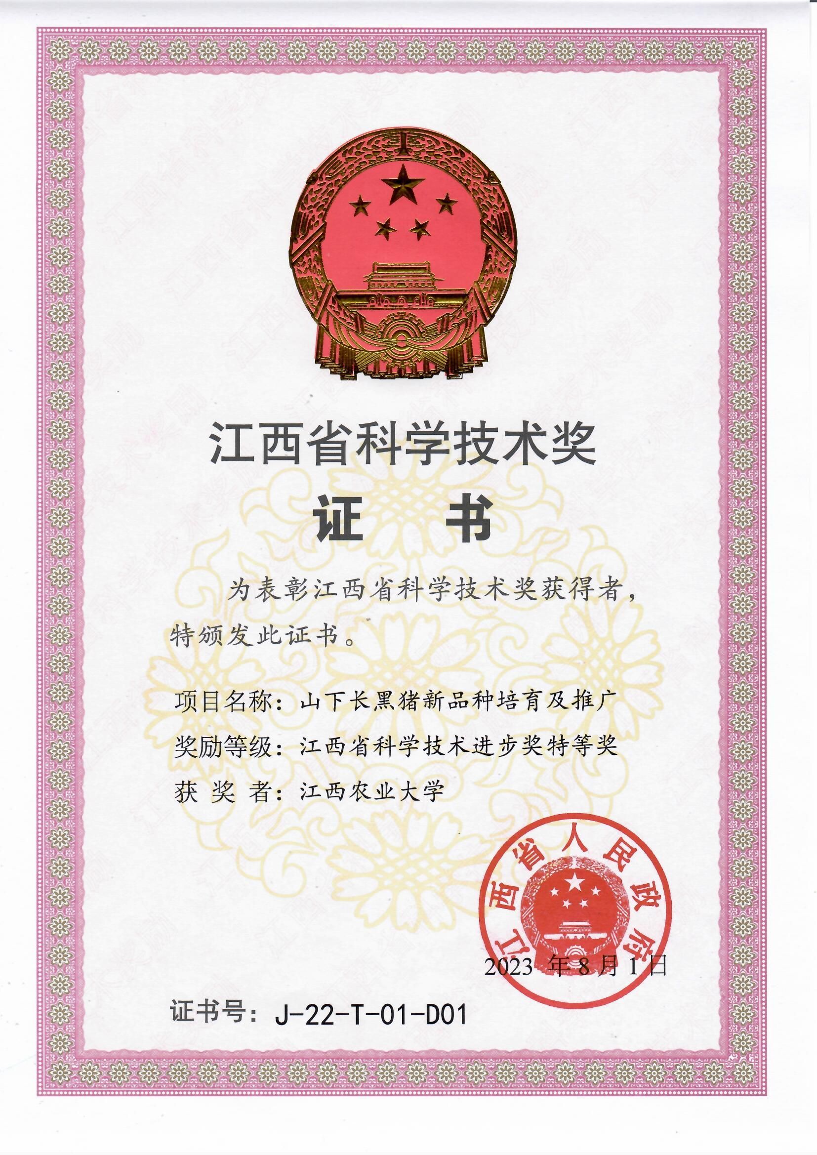 2023年10月,在江西省科學技術獎勵大會上,由我校黃路生院士團隊牽頭,聯(lián)合江西山下華系種豬養(yǎng)殖有限公司和南昌師范學院完成的項目“山下長黑豬新品種培育及推廣”榮獲江西省科學技術進步獎特等獎。2023年5月,山下長黑通過國家畜禽新品種認證,實現(xiàn)了江西省1999年至今24年來畜禽國家審定新品種的新突破,標志著我國在高端種豬資源領域攻破了國外技術壁壘,為國家生豬種業(yè)自立自強、核心種源自主可控作出了重大貢獻。