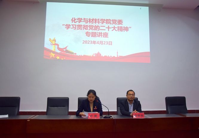 為全面營造主題教育理論學習良好氛圍,進一步推進黨的二十大精神宣傳貫徹走深走實,4月23日,化學與材料學院邀請馬克思主義學院博士宣講團副團長潘錫楊博士為學院全體師生黨員作學習貫徹黨的二十大精神專題輔導報告。學院全體師生黨員近100人現場聆聽報告。