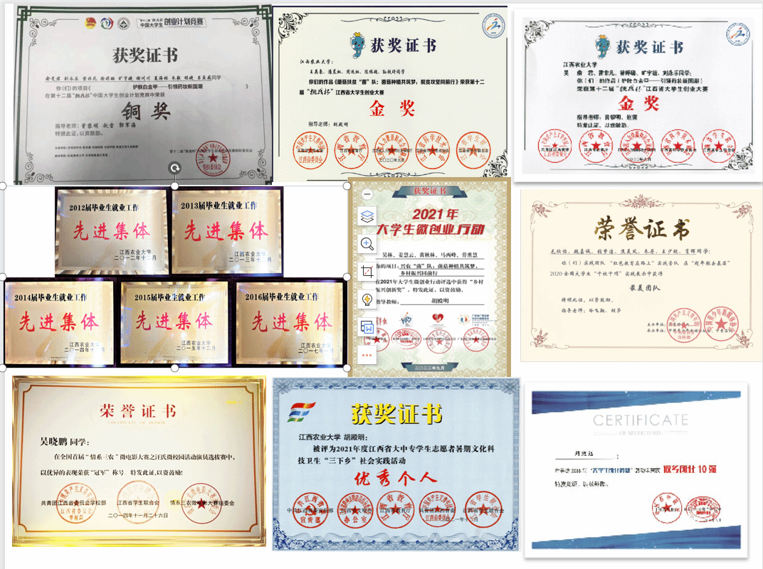 這十年,學院學生工作緊緊圍繞立德樹人的根本任務,強農興農的神圣使命,以理想信念教育為核心,以培育和踐行社會主義核心價值觀為主線,圍繞著大學生“健康成長、立志成才”的工作目標,積極構建學生鍛煉有平臺、學生學習有風氣、學生安全有保障、學生管理有效率的學生工作新局面。學院通過多方式、多平臺不斷強化學生思想政治教育、理想信念教育、安全健康教育、學業及就業指導服務等,依托學生骨干培訓、大學生創新創業競賽、校園文體活動、暑期“三下鄉”志愿服務、寒假“返家鄉”志愿服務等系列活動,增強大學生愛黨、愛國、愛中國特色社會主義教育,引導大學生樹立正確的世界觀、人生觀和價值觀。十年來,學院連續四年獲評校學生工作先進單位,連續五年獲評校就業工作先進單位,考研升學率屢創新高,2022年達到45.28%;在“互聯網+”“挑戰杯”等全國大學生創新創業大賽中獲得國家銅獎、省級金獎、銀獎等獎項累計30余項;學院獲“趁年輕 去基層”全國大學生“千校千項”實踐最美團隊、江西省志愿服務先進集體及省“三下鄉”社會實踐先進服務營隊等榮譽;指導學生獲得全國“情系三農”微電影大賽冠軍、全國返鄉創業10強,全國大學生英語競賽江西賽區特等獎等,學生工作育人成效斐然。