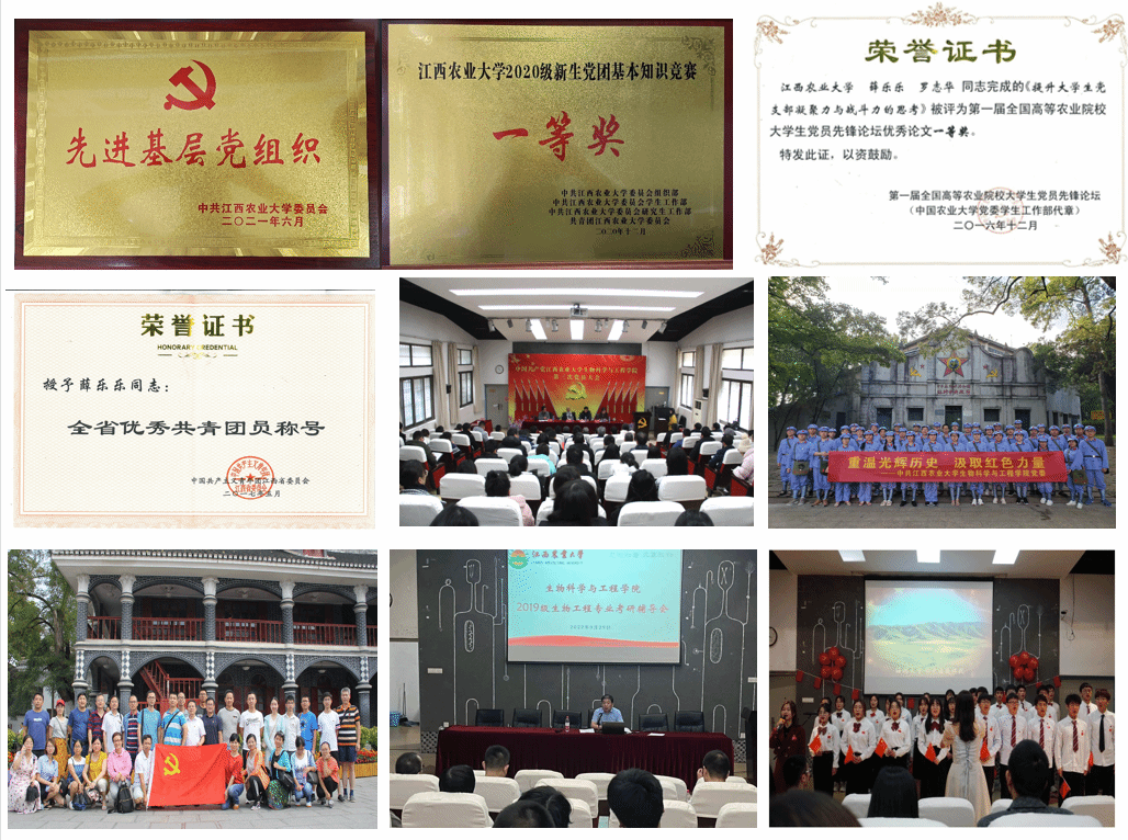 這十年,學院全面貫徹落實新時代黨的建設總要求,嚴格落實黨建工作責任制,堅持以高質量黨建引領高質量發展。堅持鑄魂立心,強化理論武裝,推進理論學習常態化。深入開展“不忘初心、牢記使命”主題教育和黨史學習教育;強基固本,扎實推進黨建“三化”建設,推動黨建與學科發展、人才培養、學風建設深度融合,構建了“菌菇成長3+1”黨建品牌建設,成立了考研工作室助力考研指導幫扶,完善了對外科技服務管理辦法,建立了科技咨詢、科技服務的骨干隊伍和長期合作基地。學院黨員教師每年進行科技服務不低于50人次,肩負起“強院興校”的光榮使命,傾情服務于江西地方經濟發展,為推進我省高質量發展貢獻力量。學院先后榮獲先進基層黨組織、校新生黨團知識基本知識競賽一等獎、全國農林水高校第一屆黨建論壇一等獎、全省優秀共青團員、全省高校優秀心理委員等榮譽,以實際行動踐行服務宗旨,厚植為民情懷,使基層黨組織的戰斗堡壘作用發揮更明顯,黨員的先鋒模范作用發揮更突出。
