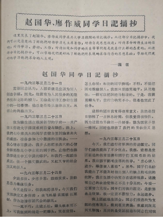 1963年5月4日:“今天是‘五四’青年節,系里開了慶祝大會,我覺得雷鋒能做到的,我們一定能做到。但現在,雷鋒已經做的,而我們還沒有去做,說明我們和雷鋒相比較是做得太少、太少了。”